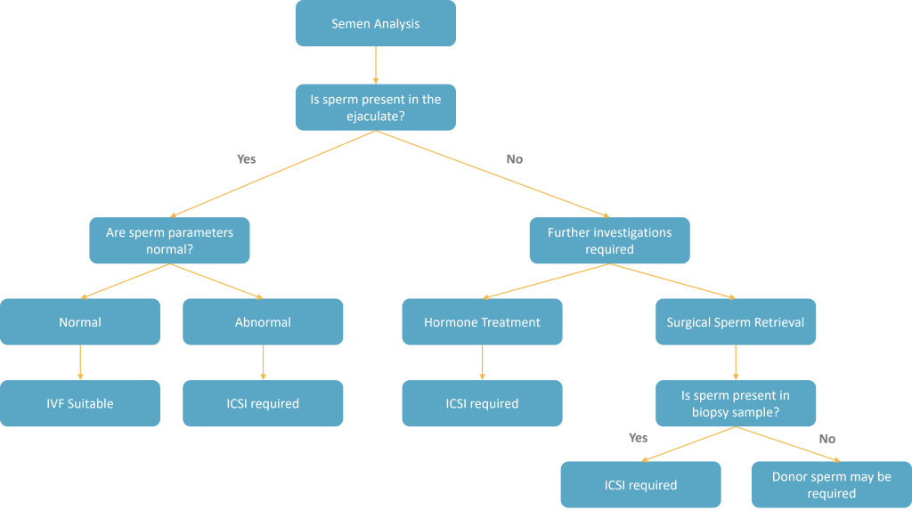 The woman will be required to undergo ovarian stimulation to prepare her eggs for collection as in a traditional IVF treatment plan. The sperm from the male partner will then be processed, washed and inspected in our laboratory to select only one sperm which will then be carefully injected into a retrieved e.g. the aim is to inject the most normal looking sperm with good progressive movement into each egg. In cases of surgically retrieved sperm, ICSI will be required.